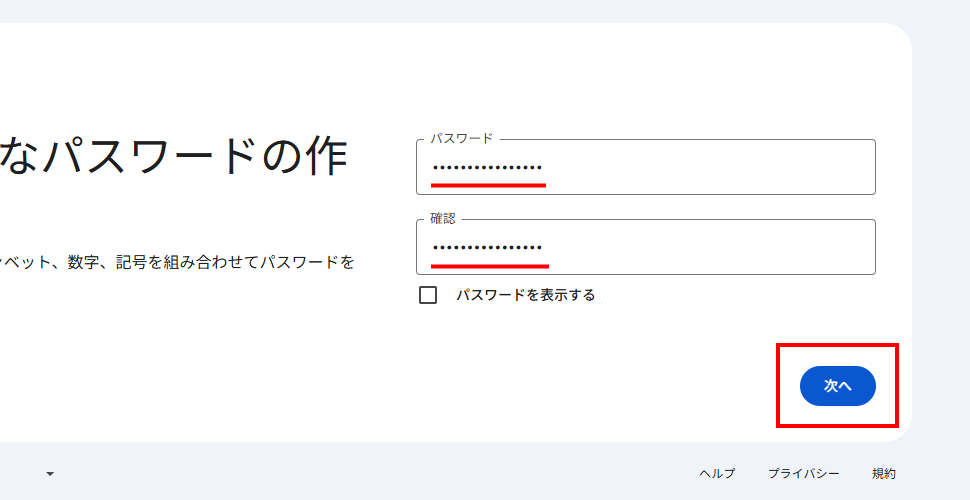 確認のために二か所に同じパスワードを入力してください。パスワードの入力が終わりましたら「次へ」をクリックしてください。